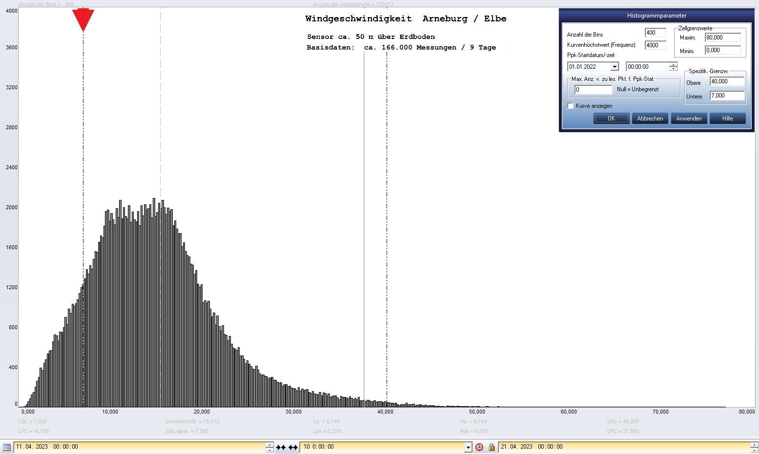 Histogramme Grenzwerte (gestrichelte Linie, roter Pfeil) 7 km/h (Start Energieerzeugung) und 40 km/h