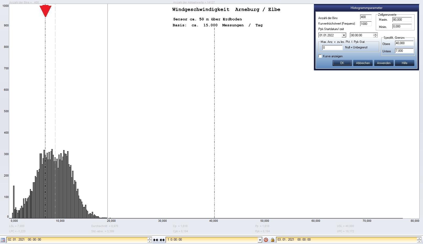 Arneburg Tages-Histogramm Winddaten, 14.01.2021