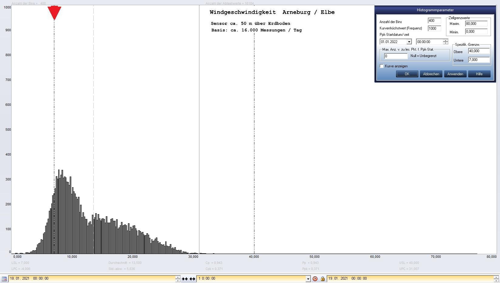 Arneburg Tages-Histogramm Winddaten, 18.01.2021
