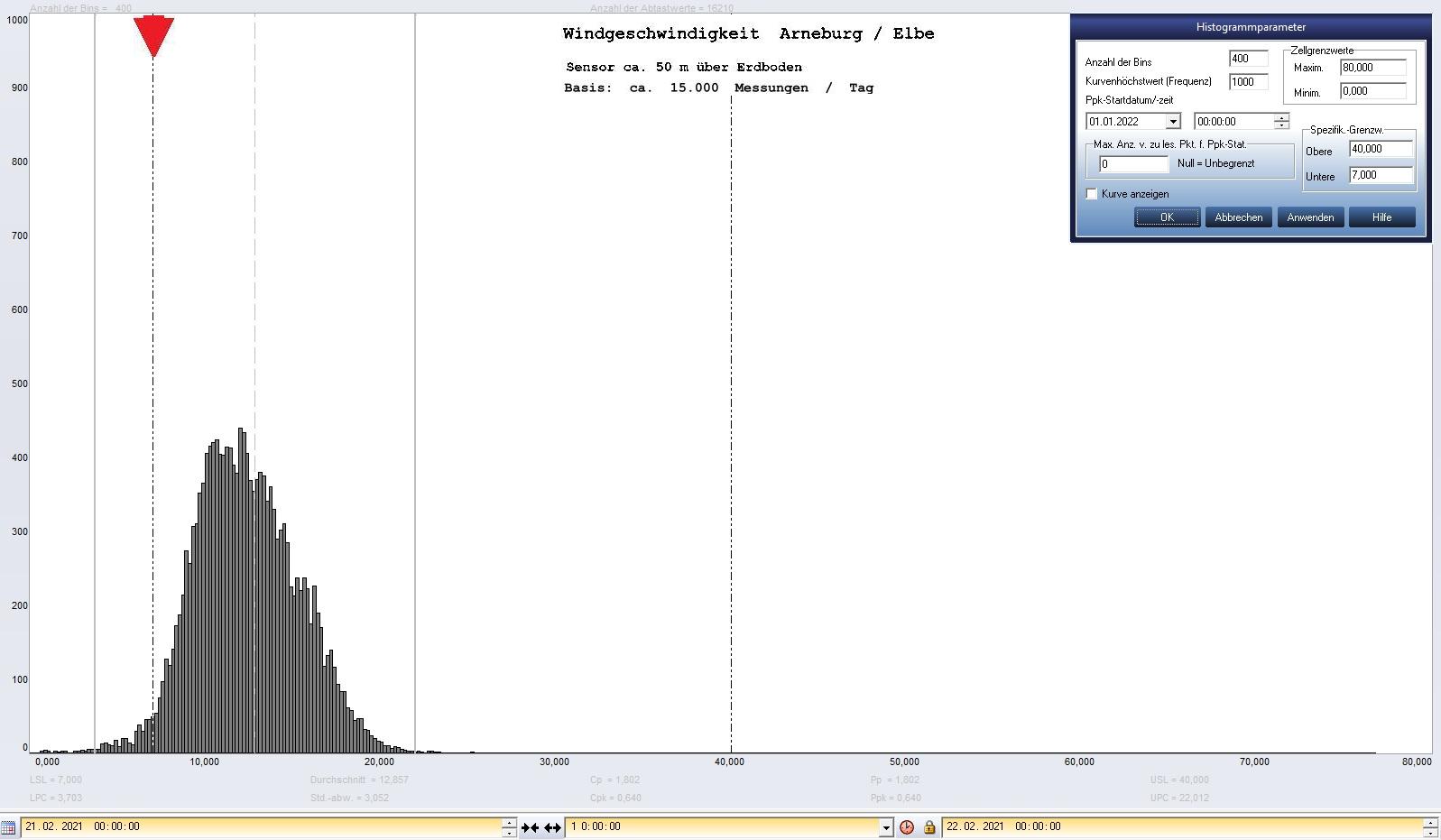 Arneburg Tages-Histogramm Winddaten, 22.02.2021
